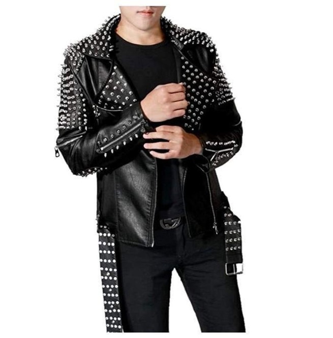 Handmade Men Punk Style Black Sliver Studded Brando Biker Leather Jacket