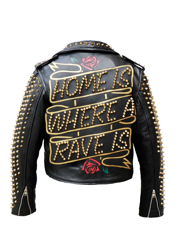 New Men Women's Custom Made Black Leather Full Metallic Studded Home Is Where A Rave Is Printed Zipper Belted Stylish Leather Jackets