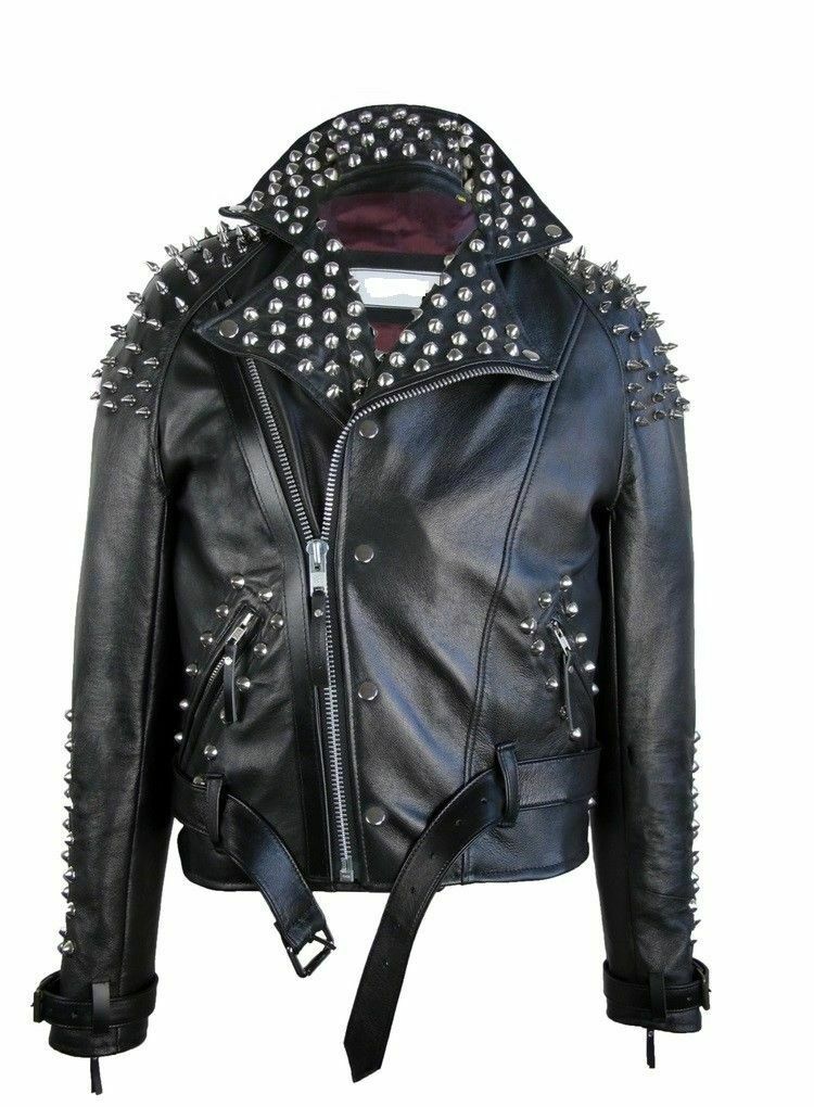 New Mens Handmade Jackets Studs Silver Motorcycle Cowhide Leather Slim Fit Jacket