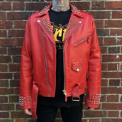 New Men,s Red Color Classical Real Leather Jacket Spiked Silver Studded Shoulder