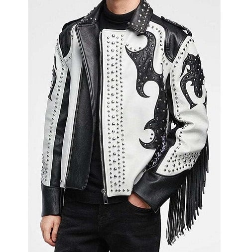 Handmade Men Two Tone Biker Studded White Leather Jacket, Motorcycle Jacket