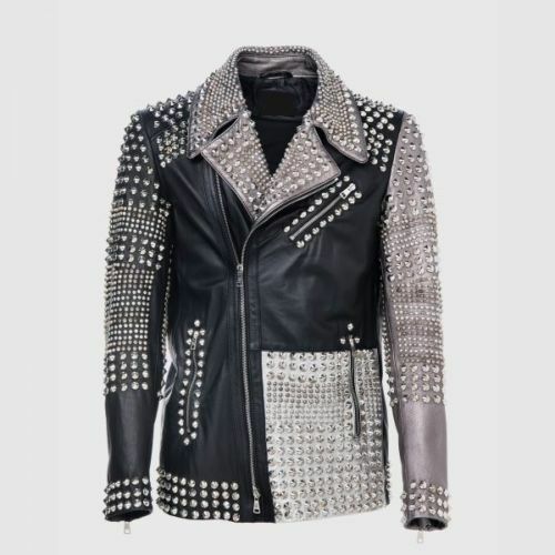 HANDMADE MENS FASHION REAL SILVER STUDS AND EMBROIDERY PATCHES STYLE JACKET
