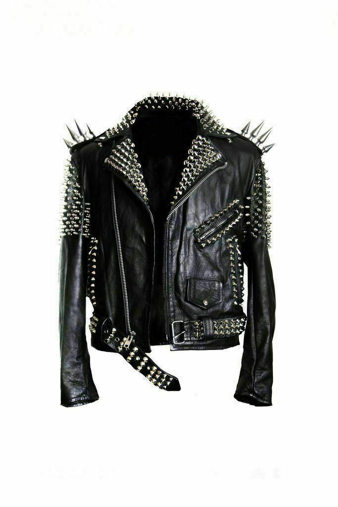 Handmade Men's Black Fashion Long Studded Punk Style Leather Jacket