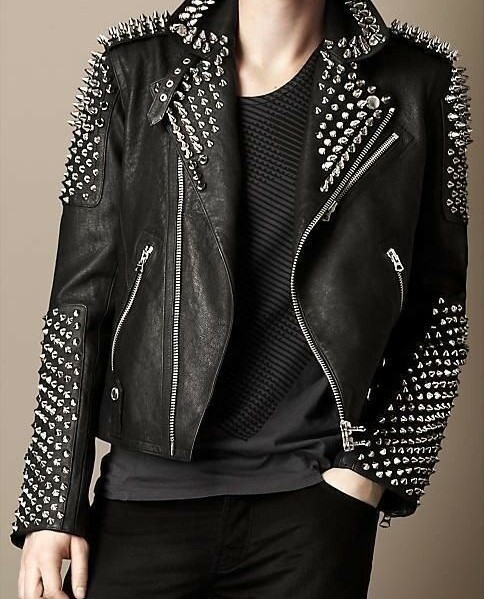 New Mens Black Punk Full Silver Metal Spiked Studded Brando Leather Jacket
