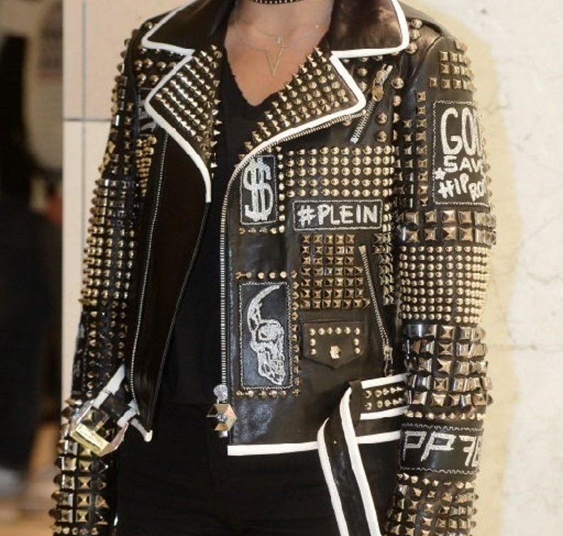 Handmade Women Philip Plein Black Fashion Studded Punk Style Leather Jacket