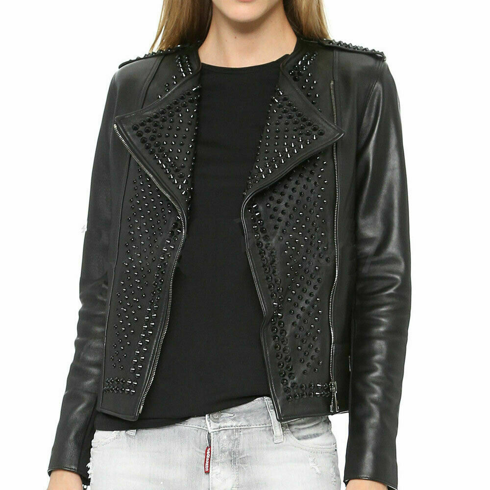 WOMENS FASHION BLACK LEATHER STUDDED MOTO BIKER JACKET MADE TO ORDER ALL SIZES