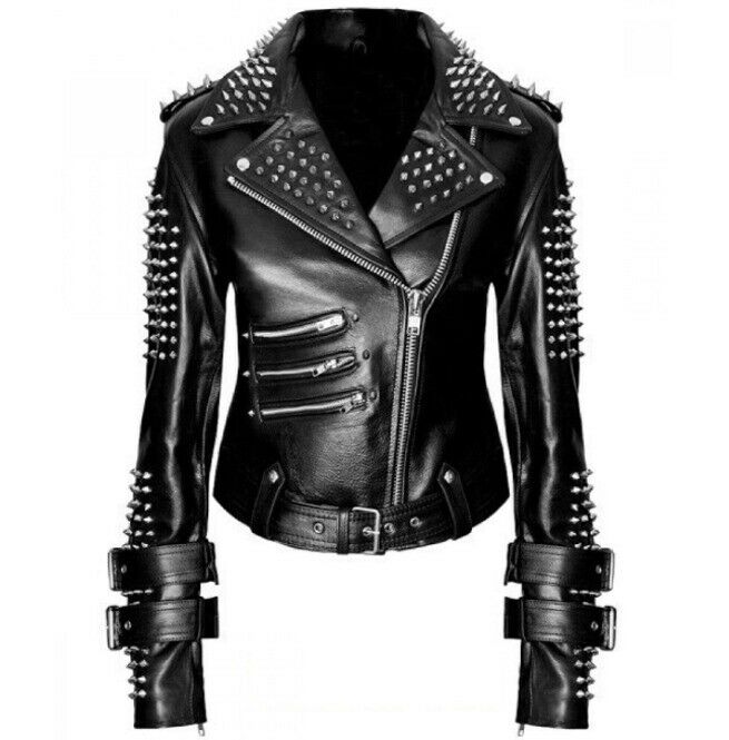 Handmade Women Black Punk Silver Spiked Studded Leather Biker Jacket