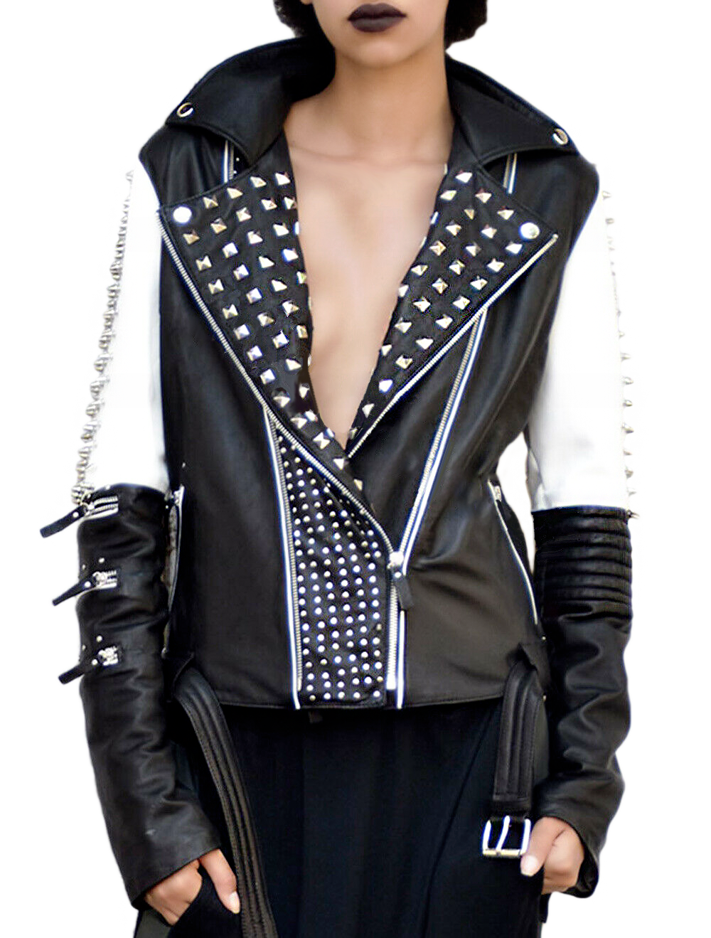 Women Leather Jacket White Black Full Silver Studded Zipper Punk Leather Jacket