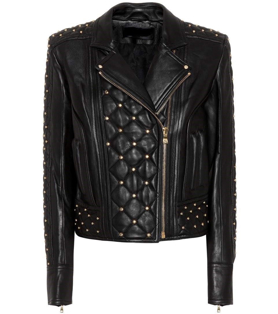 WOMEN'S FASHION BLACK REAL LEATHER STUDDED BIKER JACKET WITH HAND FIXED STUDS