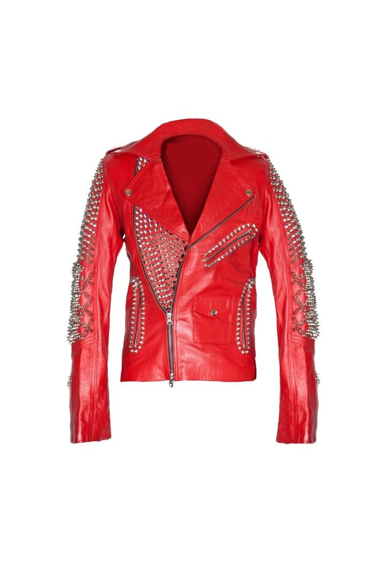 Women Red Studded Leather Jacket, Gothic Style Biker Jacket, Studded Jacket