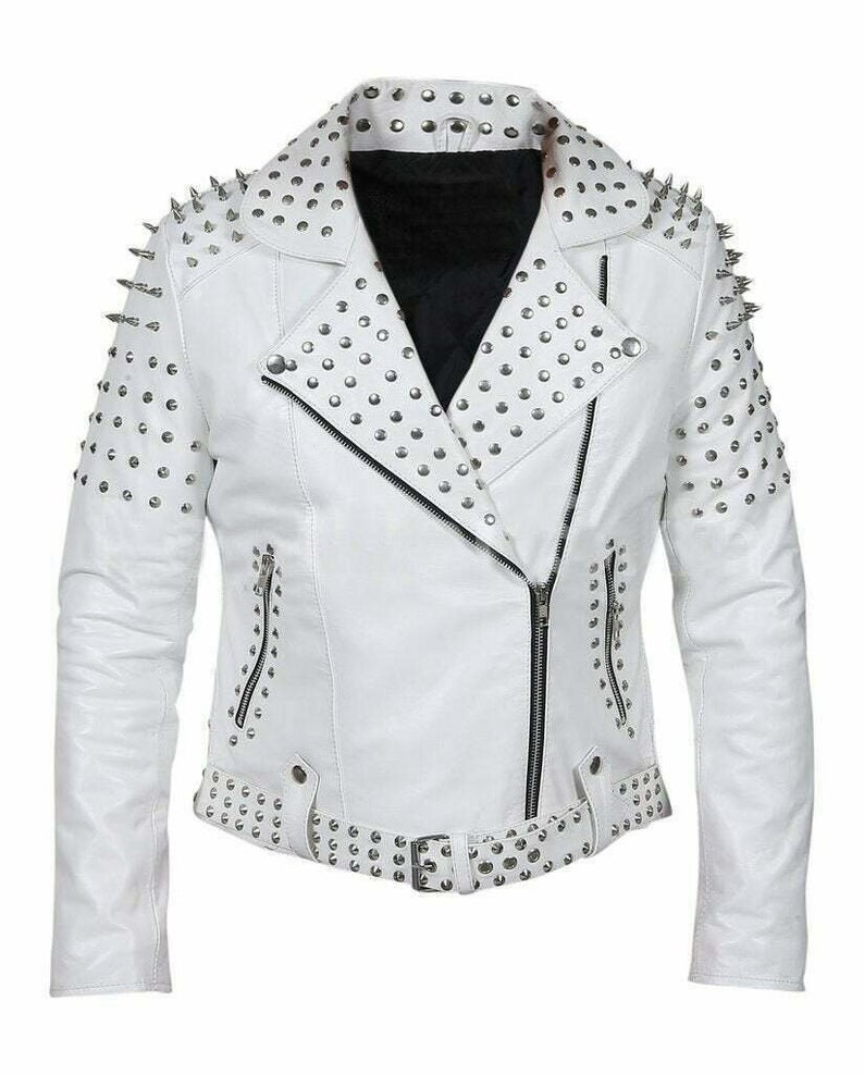 Handmade Women's Cowhide Punk Style White Leather Studded Casual Jacket