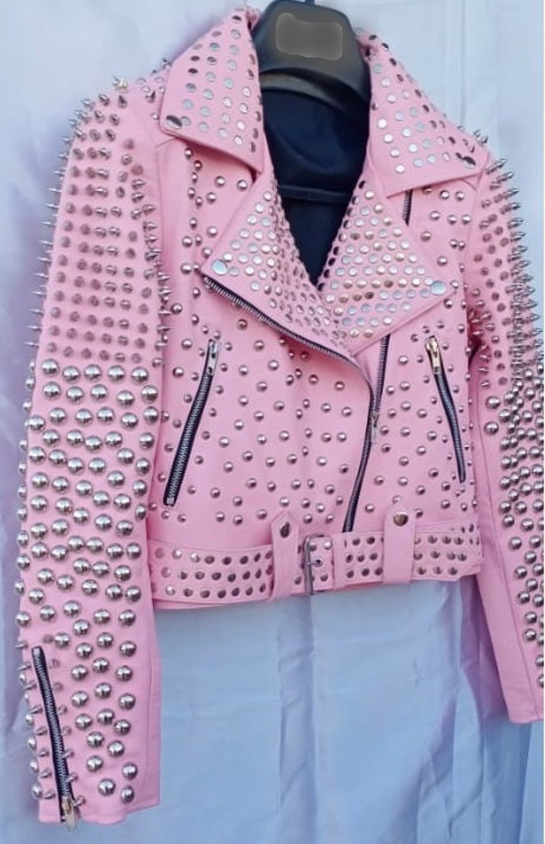 Women Pink Studded Leather Rock Steam Punk Style Biker Jacket