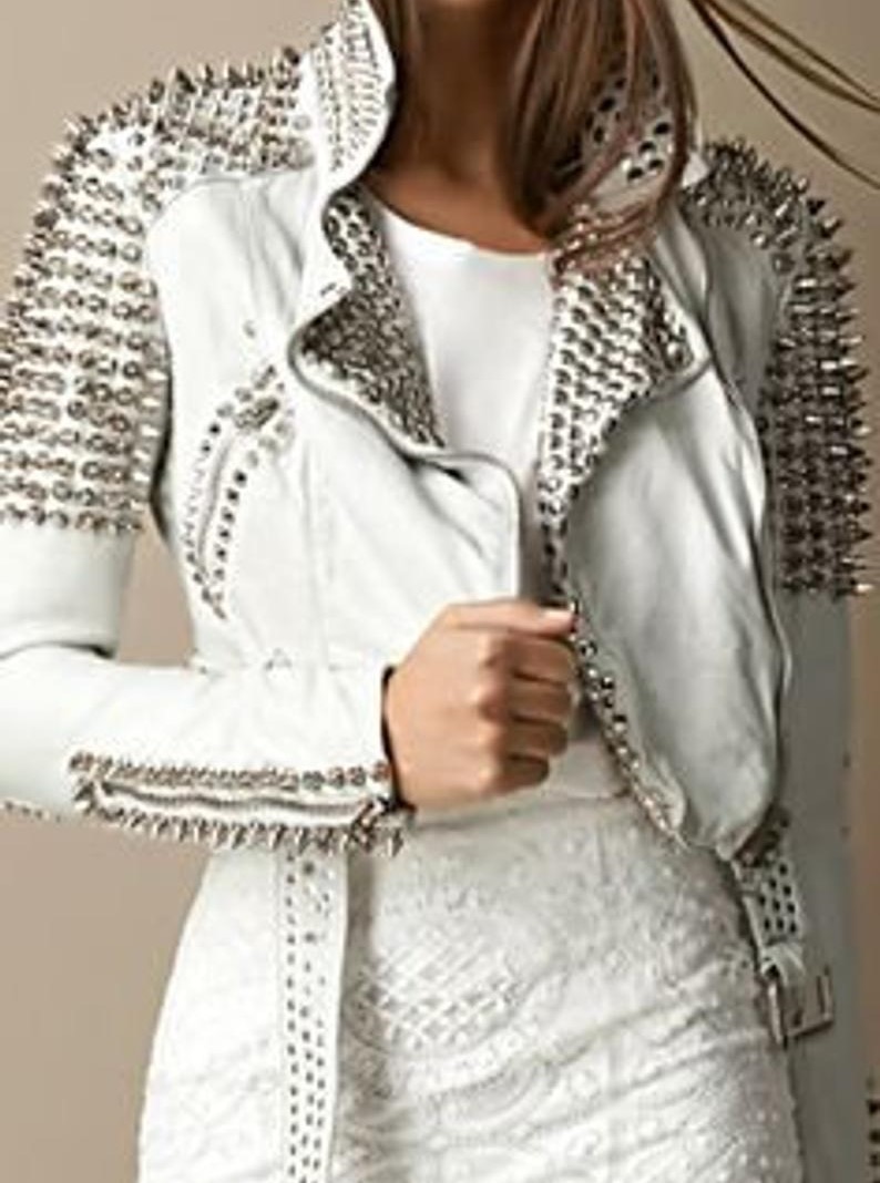 WOMEN'S FASHION PREMIUM LEATHER JACKET SILVER STUDS ON COLLAR AND SHOULDERS