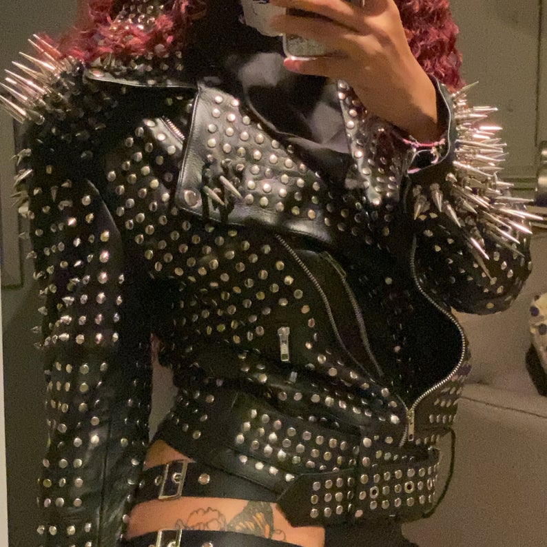 Women Silver Studded Black Leather Jacket Steam Punk Spiked Style Rockers