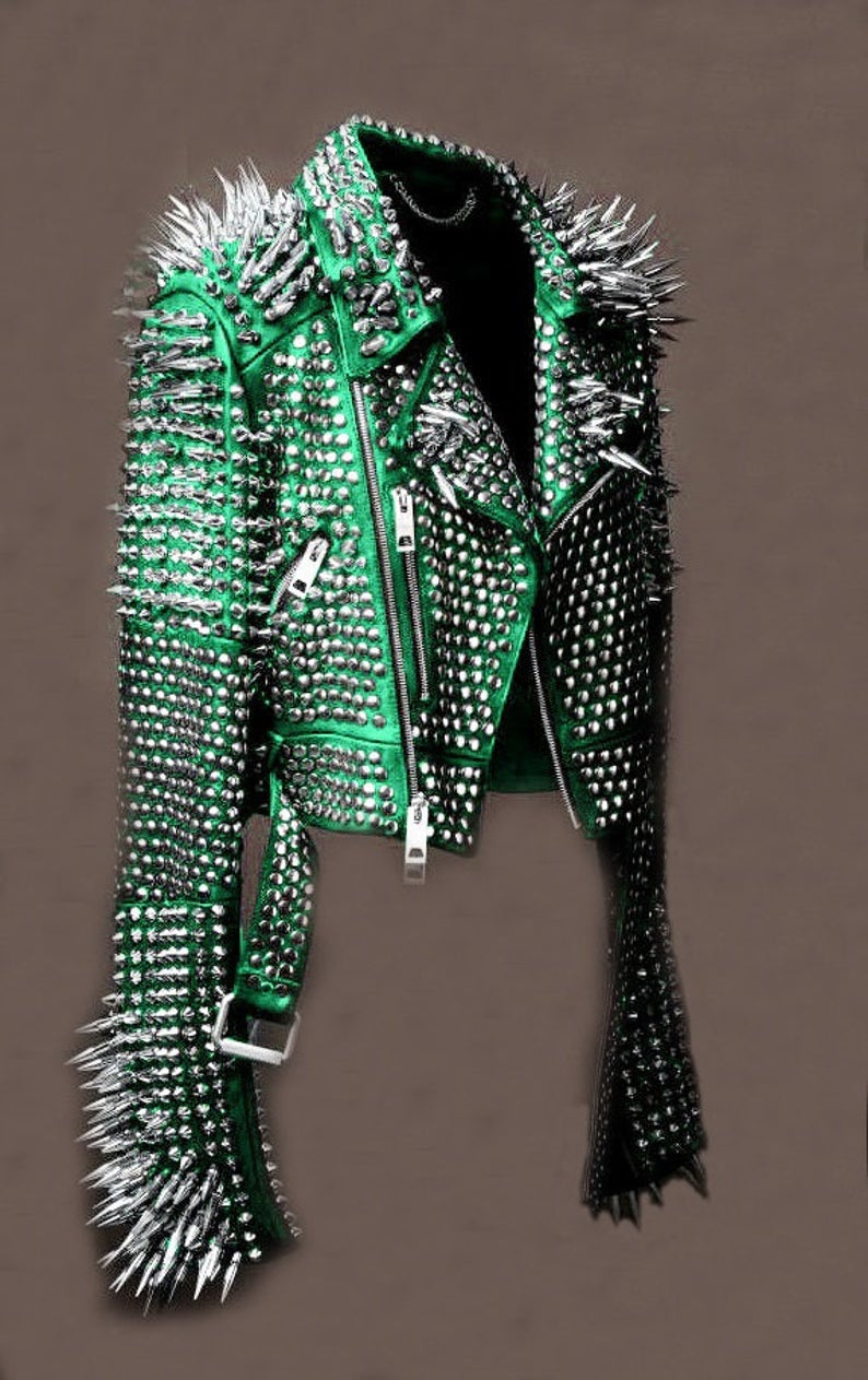 Handmade Women Multicolor Leather Jacket Rock Steam Punk Studded Biker Silver Studs Spiked Jacket