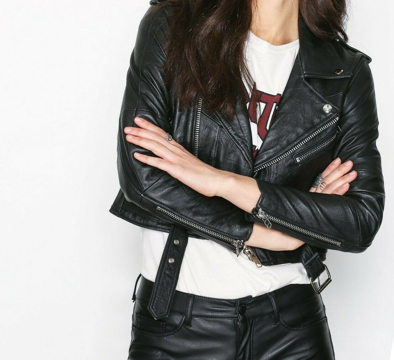 Womens Black Cropped Leather Jacket Pure Lambskin