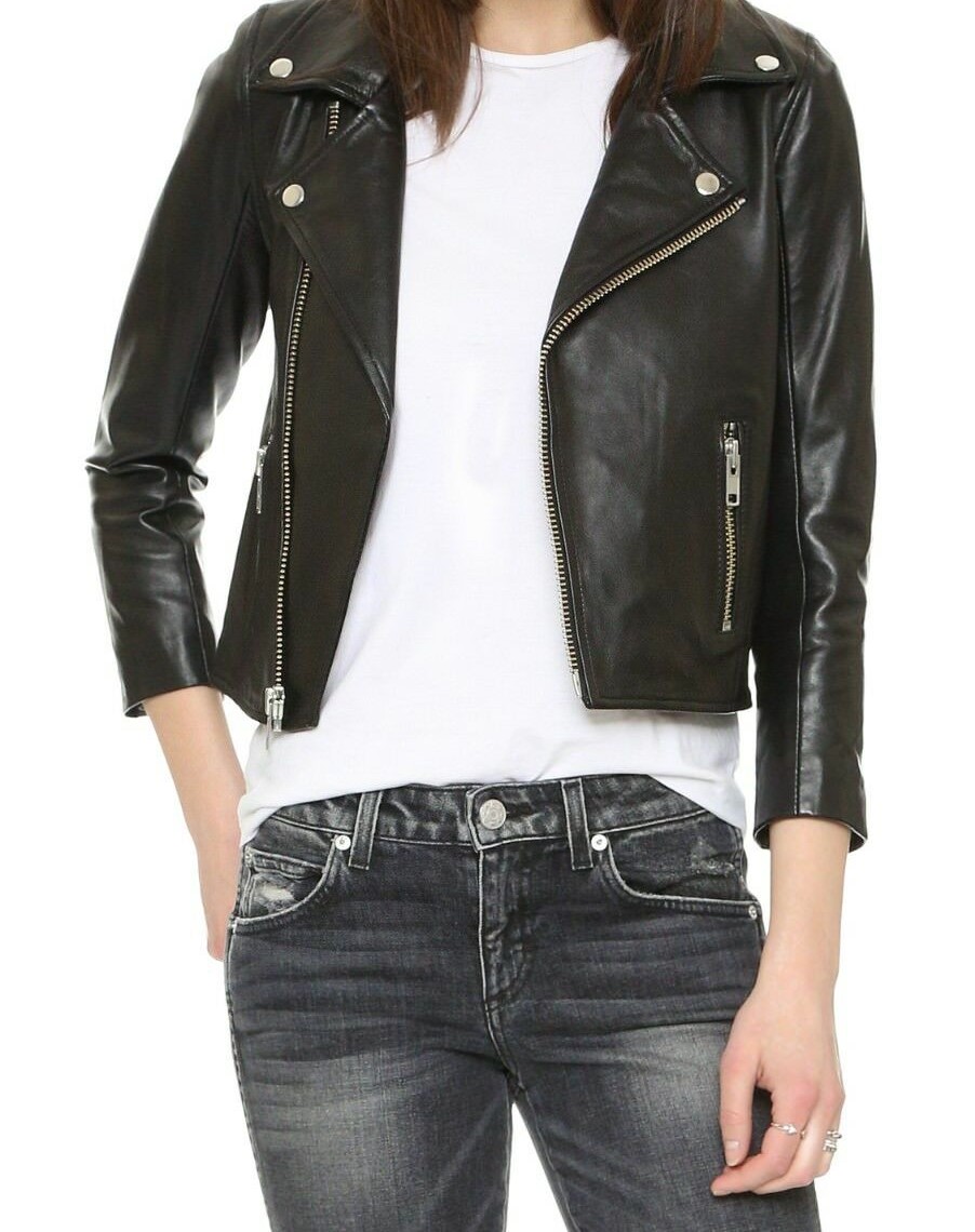 Women Leather Jacket Black Biker Moto Cropped Lambskin