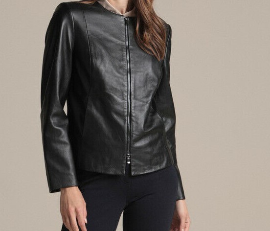 Women Leather Jacket Black Collarless Pure Lambskin