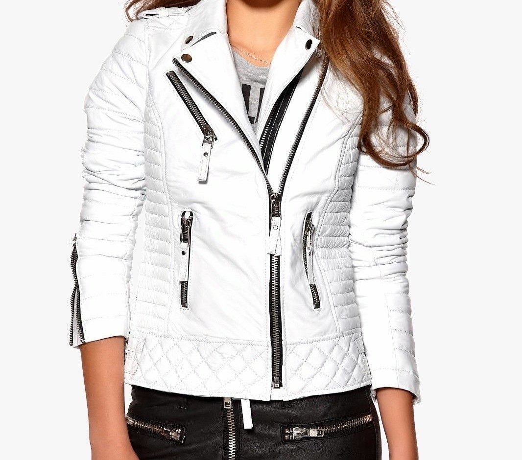 Womens Leather Jacket White Biker Motorcycle Lambskin