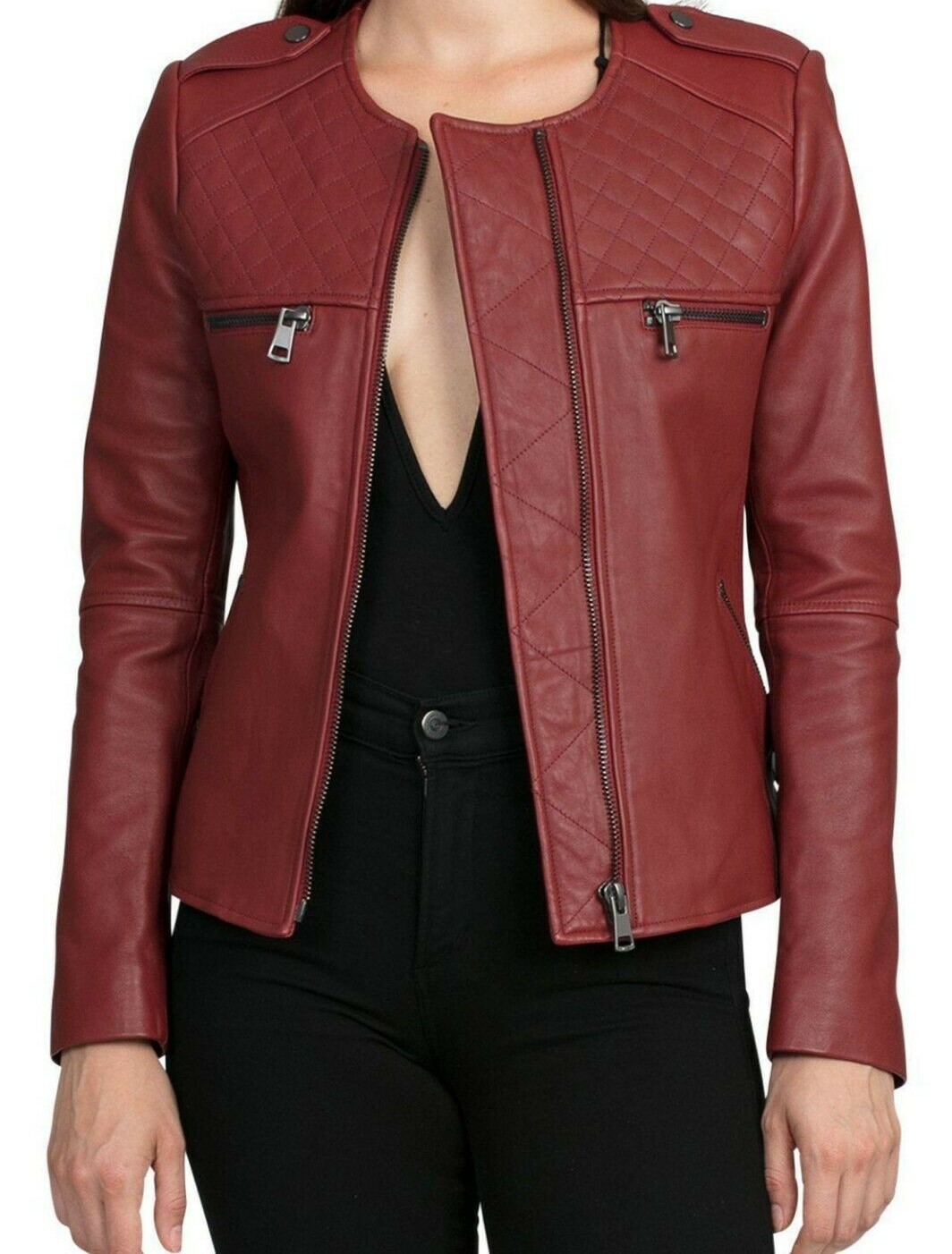 Womens Red Leather Jacket Collarless Pure Lambskin