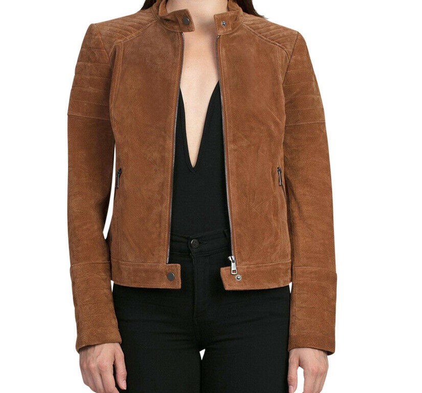 Suede Leather Jacket Women Brown Genuine Biker