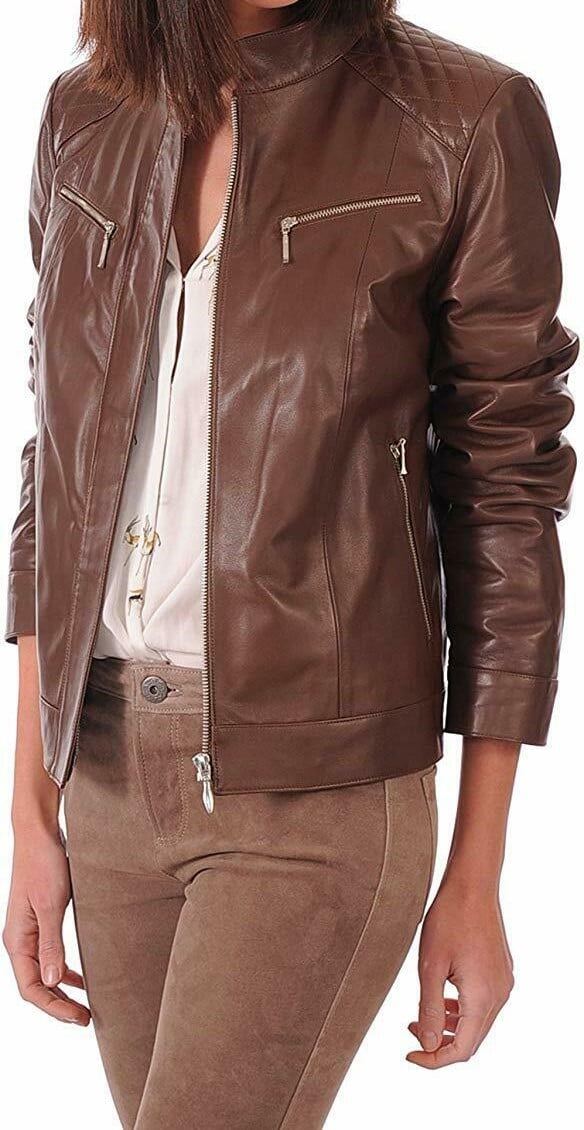 Basic Women's Genuine Real Lambskin Leather Jacket Biker Brown Casual Outwear