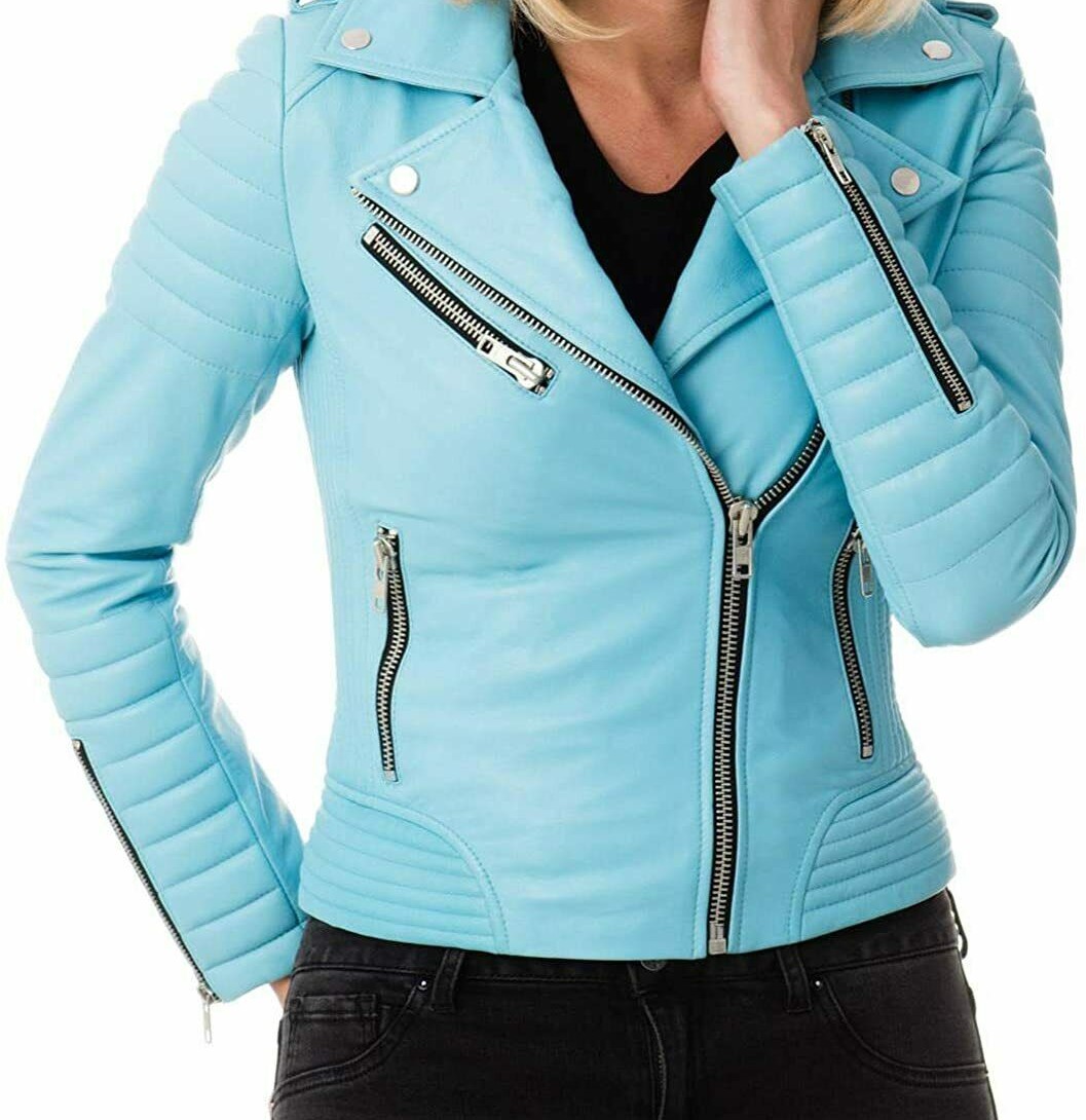 Classic Women's Genuine Sheepskin Leather Jacket Biker Blue Collared Zipper Coat
