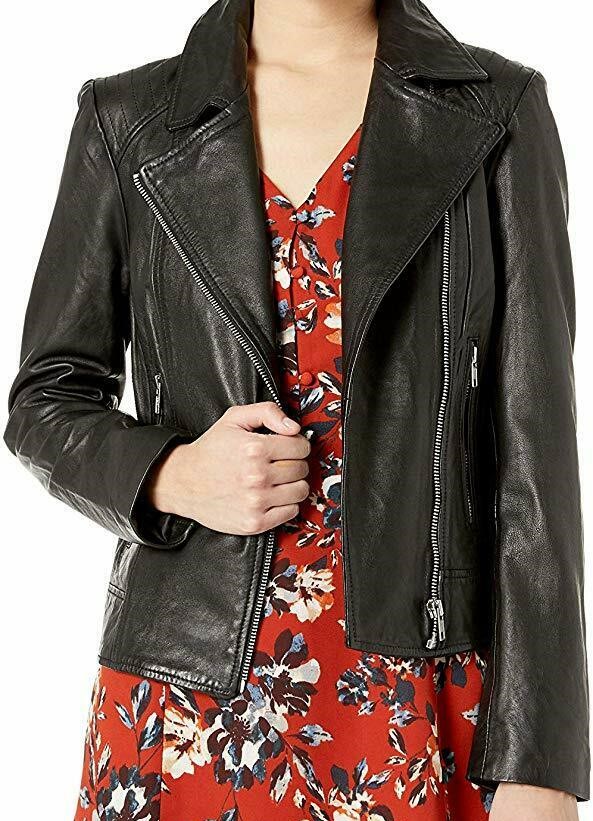 Women Real Lambskin Leather Jacket Biker Slim Fit Black Zipper Outwear