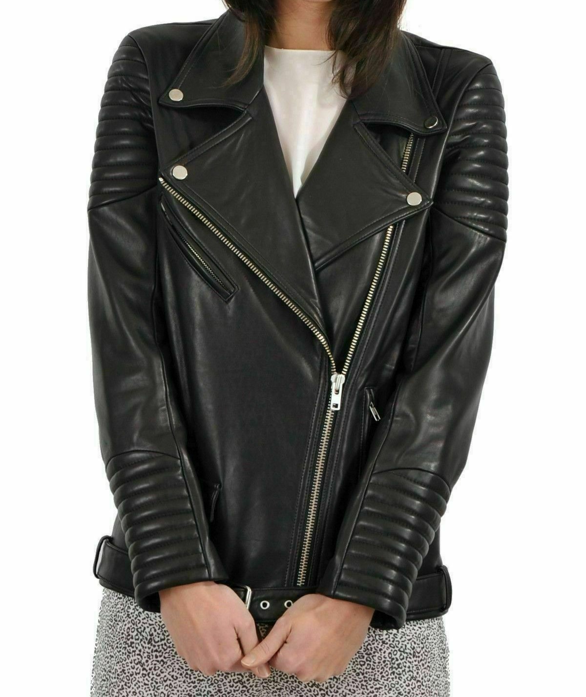 New Ladies Lambskin High Quality Soft Biker Fashion Black Belt Jacket