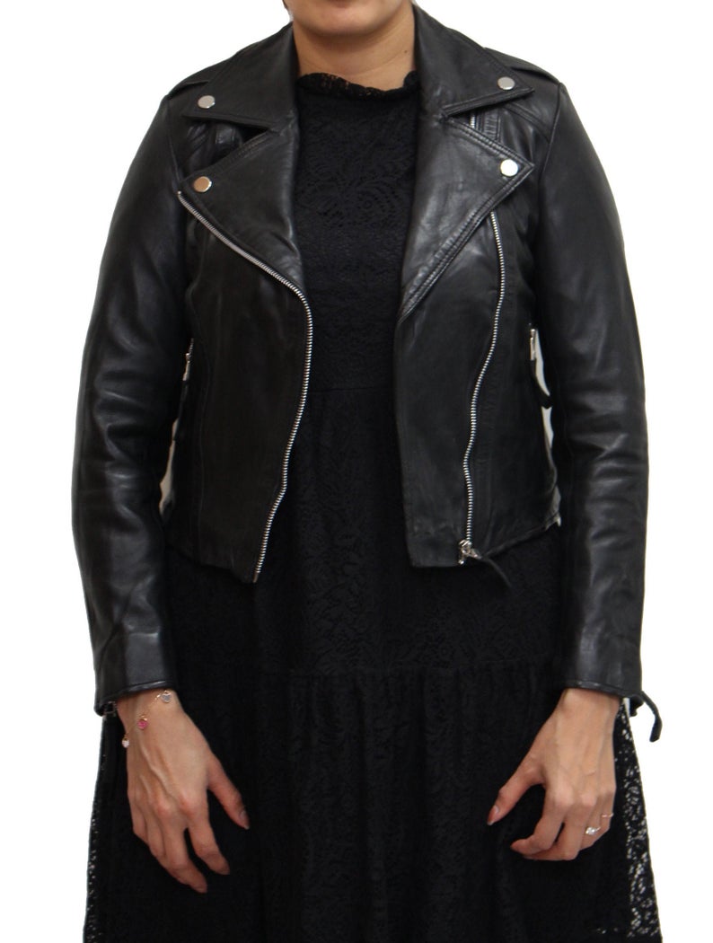Womens Brando Style Short Slim Fit Biker Leather Jacket with Side Zip available in Black.
