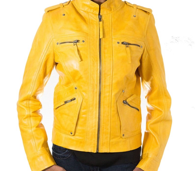 Yellow vintage leather fitted biker jacket with mandarin collar