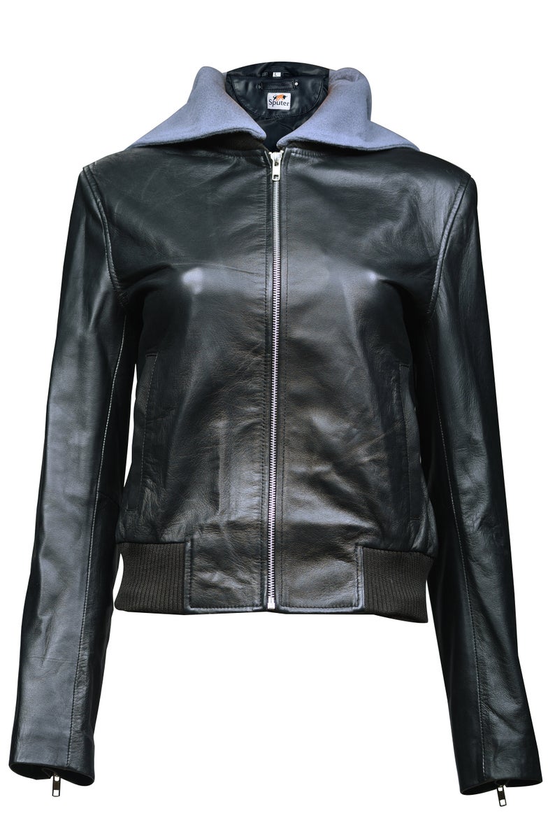 Black and Gray Hooded Bomber Real Leather Jacket
