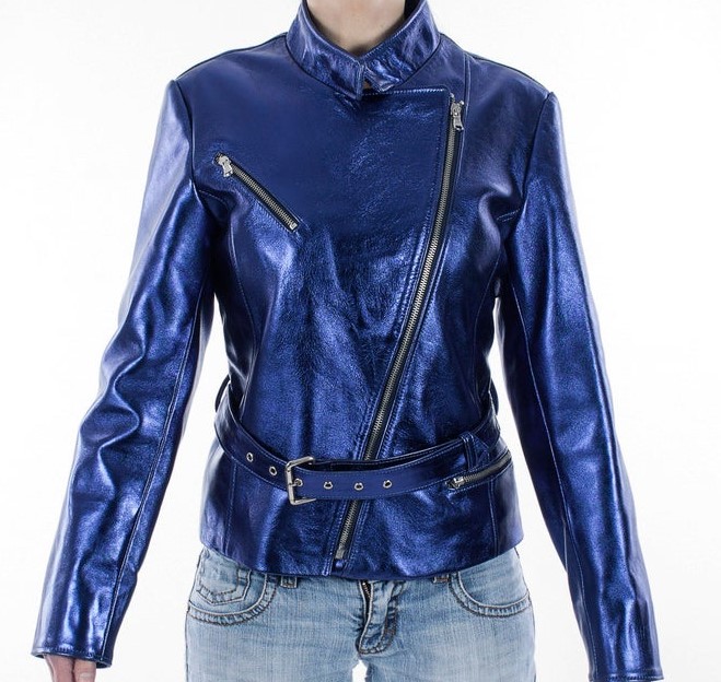 Italian handmade Women genuine lambskin leather biker jacket slim fit Metallic Blue