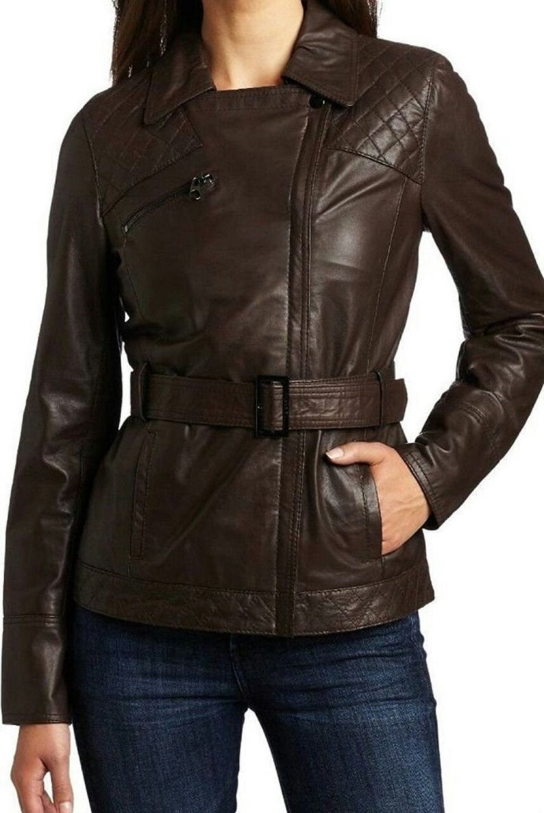 Women 90’s Style Retro Biker Leather Belted Jacket Women Vintage Brown Real Leather Coat Ladies