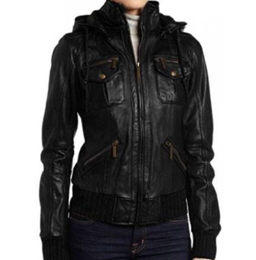 Womens Hoodie Jacket, Black Color Hooded Leather Jacket, Women’s Jackets