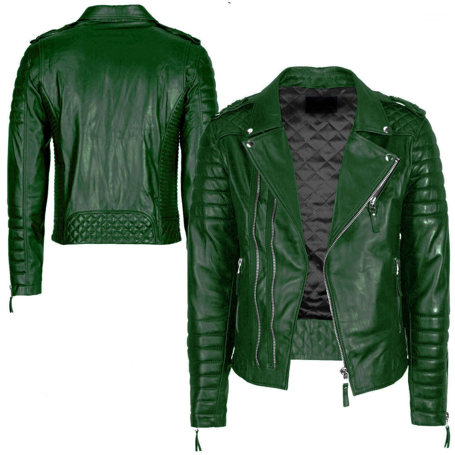Men Women Green Cafe Racer Style Biker Motorcycle Genuine Leather Jacket