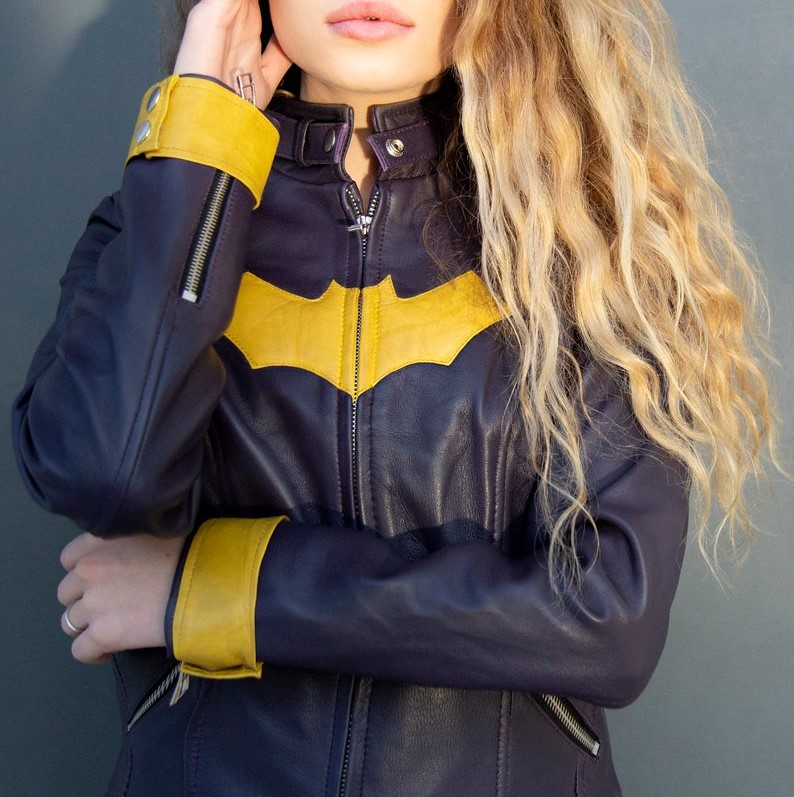 Womens Batgirl Purple Yellow Bat Leather Jacket Motorcycle