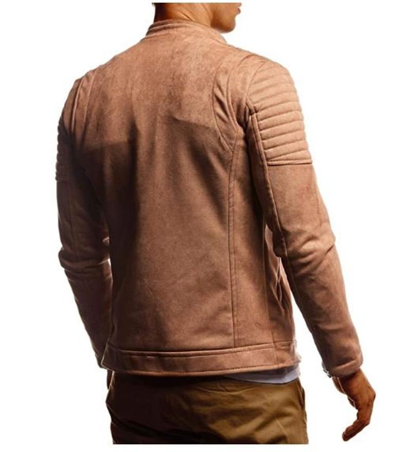 Men's Beige Biker casual quilted transition summer velvet stand-up collar faux leather jacket