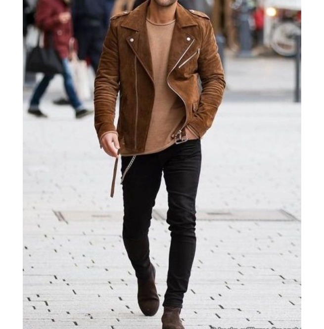 Mens Tan Brown Suede Biker Jacket, Men Brown Biker Suede Leather Jacket