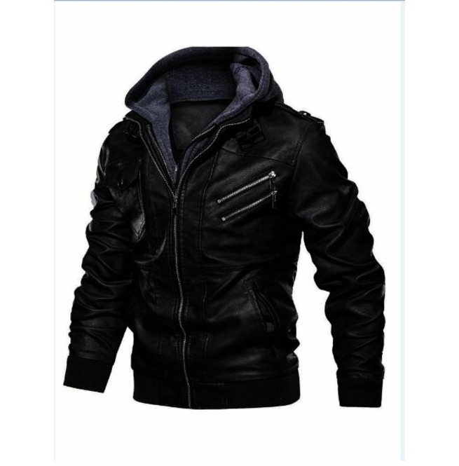 Men Black Leather Fashion Jacket With Hoodie, Bomber Style Hooded Jacket