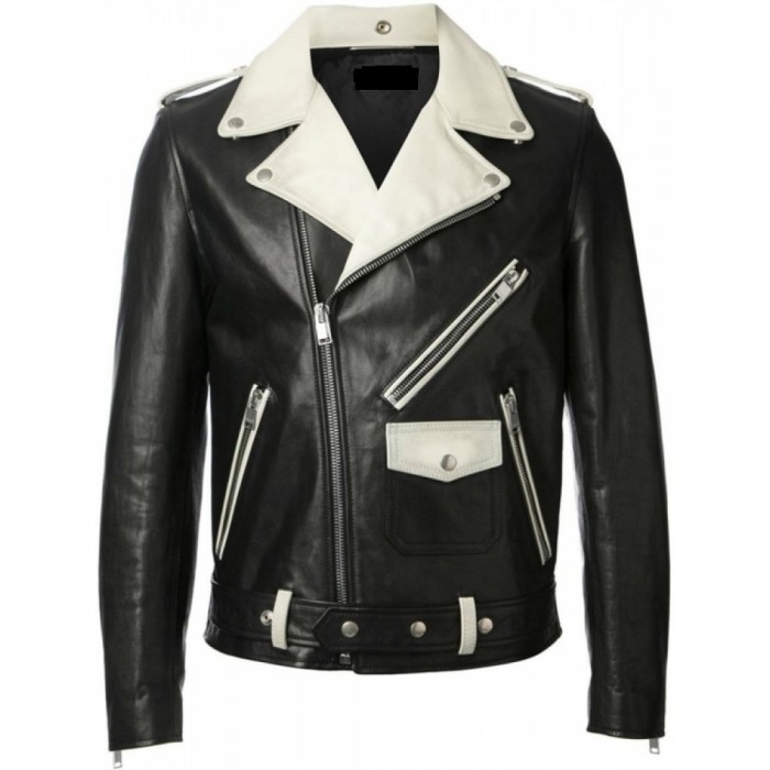 Men's New Custom Made Black & White Leather Zipper Style Buttons Biker Leather Jacket