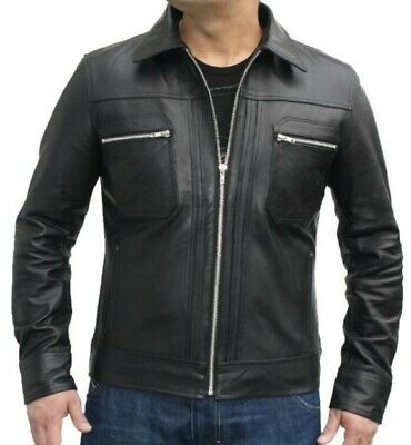 Slim Fit Black Leather Jacket Zipper Chest Pocket, Men's Leather jacket
