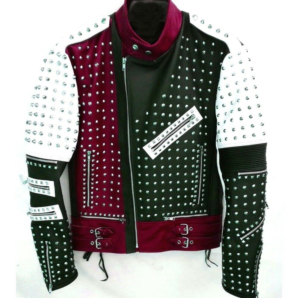 New Men's Handmade Unique Design Full Studded Biker Leather Jacket Maroon Black White Leather Fashion Jacket