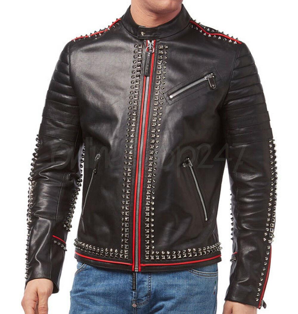 New Handmade Men Black Silver Studded Red Piping Punk Zipper Fashion Leather Jacket