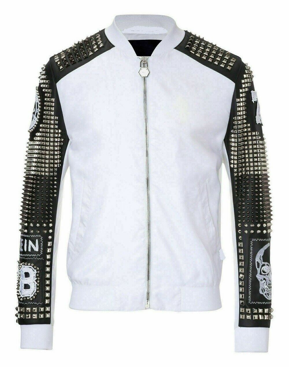 Men's White Black Silver Studded Embroidery Patches Leather Coat