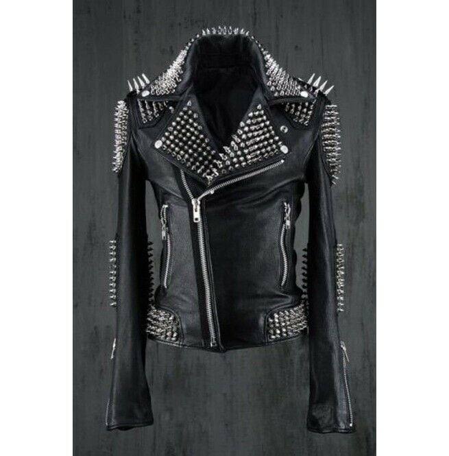 Handmade Men Black Punk Silver Long Spiked Studded Leather Jacket