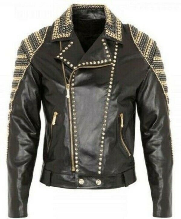 New Black Handmade Pure Leather Silver & Golden Studded Fashion Jacket For Men's