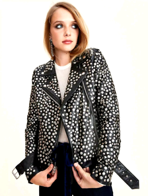 New Woman Punk Rock Full Silver Metallic Rivets Studded Brando Leather Jacket