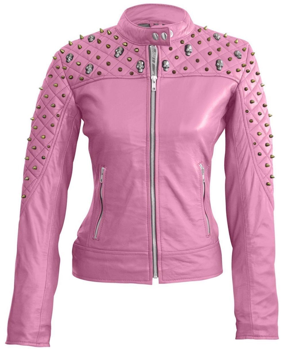 WOMENS FASHION PINK JACKET LONG SLEEVES HAND FIXED GOLD STUDS PURE REAL LEATHER