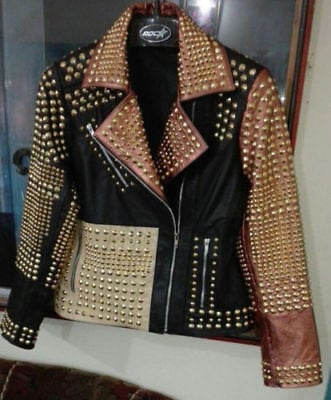 WOMENS PUNK ROCK GOLD STUD FASHION JACKET REAL QUALITY LEATHER STUDDED JACKET
